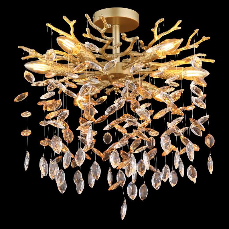 Materiál kov zlatej matnej farby, sklenené krištále jantárové, číre