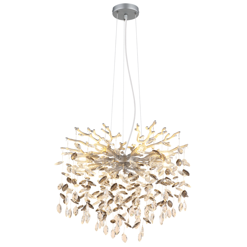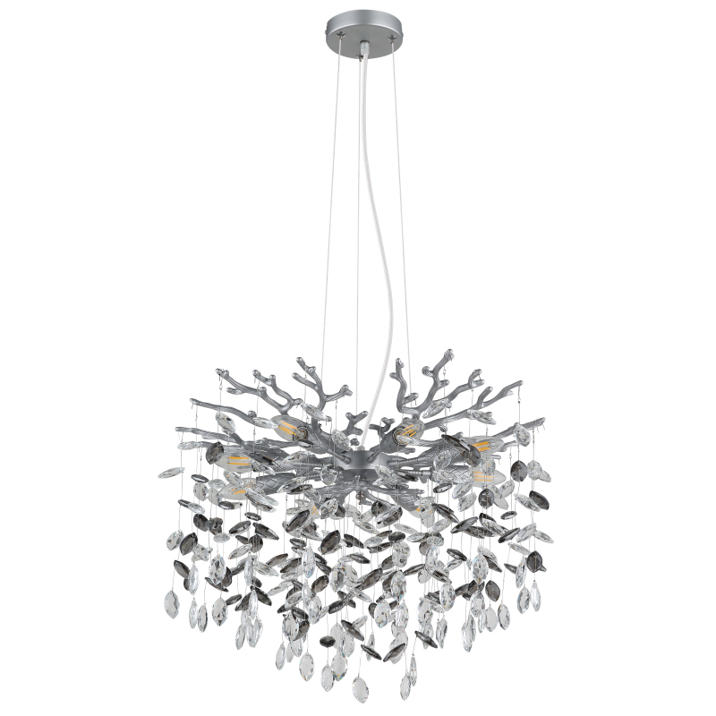 Okrúhly luster s príveskami z dymového krištáľu sa stane ozdobou vášho domova. Závesné svietidlo QUEENA v sebe spája elegantný dizajn s nádychom extravagancie. Umne rozvetvené telo z matného kovu striebornej farby pripomína jemné vetvičky a dodáva svietidlu nevšedný vzhľad. Dizajn zdokonaľujú kvalitné sklenené krištále v dymovo sivej a čírej farbe, ktoré účinne lámu svetlo a vytvárajú atmosférické odlesky. Vďaka flexibilným prvkom na objímkach E14 možno svetelné zdroje individuálne nastaviť - ideálne na nastavenie cielených svetelných akcentov a dokonalé osvetlenie miestnosti. Či už nad jedálenským stolom, v obývacej izbe alebo vo vstupnom priestore, QUEENA sa stane neprehliadnuteľným pútačom pozornosti a vytvorí sofistikovanú atmosféru s moderným šarmom. Luster je vybavený ôsmimi objímkami E14, ktoré umožňujú voľný výber farby a jasu žiaroviek.